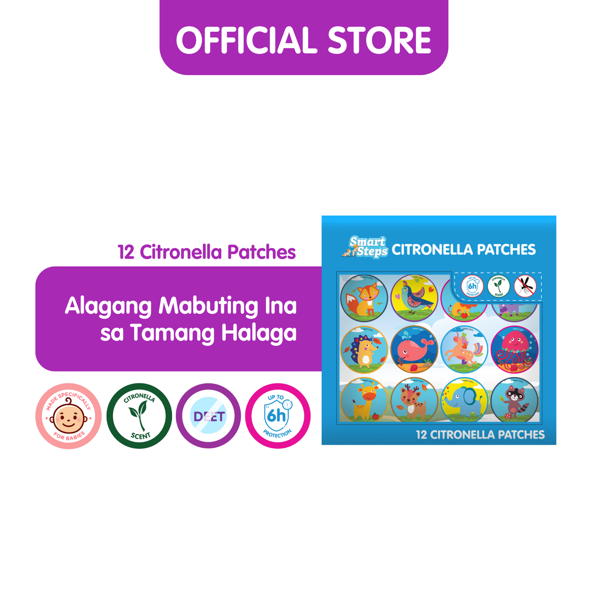 Smart Steps Stages Patches are mosquito-repellent patches that protect your children from pesky mosquitoes and insects using their fragrant citronella scent. Made with a special blend of citronella, lavender, lemon, and wormwood oils, they are safe to use for babies 6 months and up. They also come in a resealable pack so you can keep unused patches fresh for longer. Collect all 4 designs now!